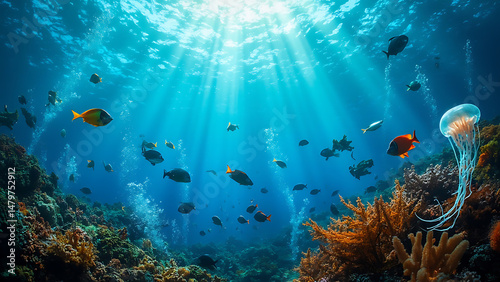 Naklejka premium Beautiful Underwater Ocean Scene with Colorful Coral and Marine Life...