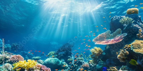 Fototapeta premium Beautiful underwater scene showcasing rays of sunlight piercing through the water, illuminating vibrant corals and a variety of colorful fish swimming around.