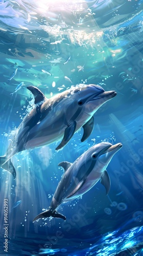 Fototapeta premium Beautiful underwater scene with two dolphins swimming gracefully. Stunning digital artwork for nature-related designs. Perfect for marine life-themed projects or ocean lovers. AI