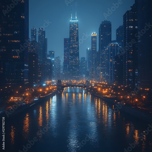 © saikat, Fototapeta premium Beautiful urban night view of chicago skyline high resolution hd photo