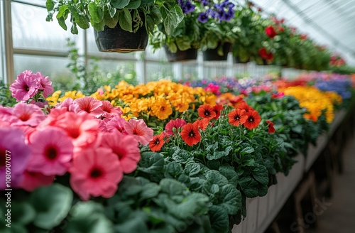 Fototapeta premium Beautiful variety of colorful flowers in a lush greenhouse setting