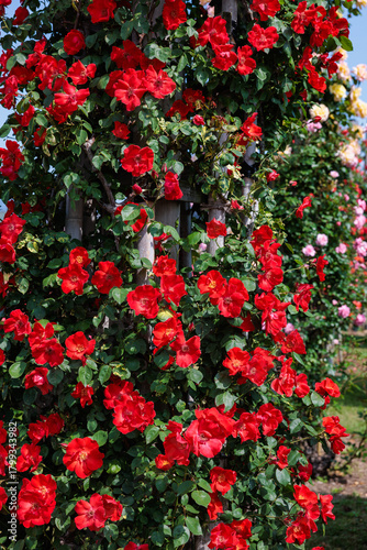 © billyfam, Obraz premium Beautiful vermilion roses blooming in a garden in Nagano.