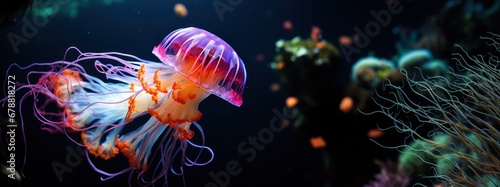 Naklejka premium Beautiful vibrant jellyfish, dark underwater scene. Wildlife background.