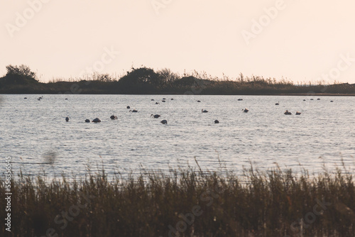 © tsuguliev, Naklejka premium Beautiful vibrant view of Korission Lake Lagoon landscape, Corfu island, Greece with pink flamingos flock, Ionian sea beach and mountains in a summer sunny day