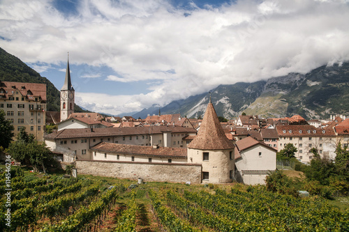 © Zuzi, Fototapeta premium Beautiful view at town Chur , vineyards and Alps mountains, Switzerland