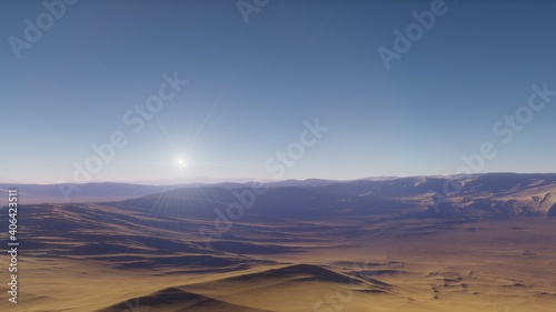 Fototapeta premium beautiful view from an exoplanet, a view from an alien planet, a computer-generated surface, a fantastic view of an unknown world, a fantasy world 3D render