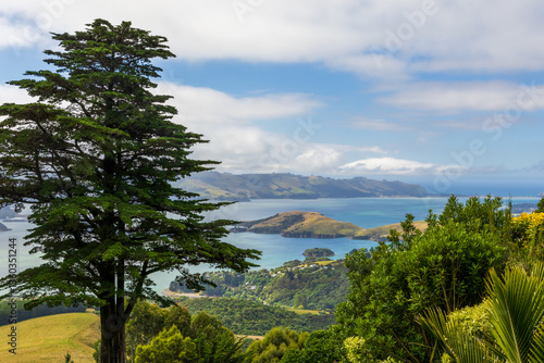 Obraz premium Beautiful view from Larnach Castle over the Otago harbor on a sunny day. Dunedin, New Zealand