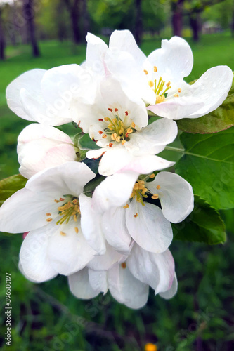 Fototapeta premium Beautiful view of a blossoming branch of an apple tree in spring.