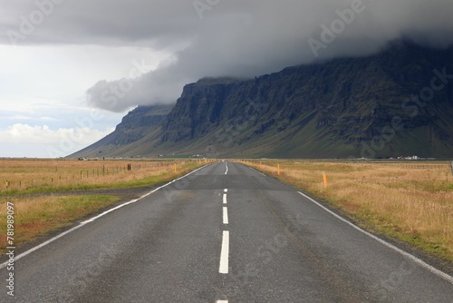 Fototapeta premium Beautiful view of a road with dry fields and mountains under the cloudy sky
