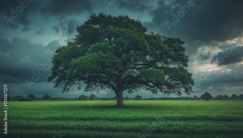 © Holo Frame, Obraz premium Beautiful view of a tree located in the center of a greenfield beneath a cloudy sky.