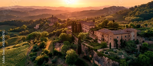© inspiretta, Fototapeta premium Beautiful view of a vineyard with a sunset in the background. The vineyard is surrounded by a wall and has a large house in the middle