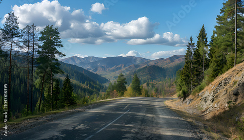 © Oleksiy, Fototapeta premium Beautiful view of asphalt road and conifer forest in mountains