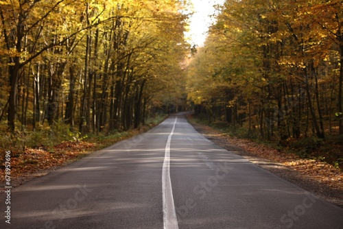 Fototapeta premium Beautiful view of asphalt road going through autumn forest