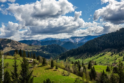 © Ionut Dragoi/Wirestock Creators, Fototapeta premium Beautiful view of green hills with lush woods against the background of the cloudy blue sky.
