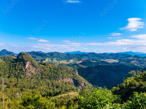 © komjomo, Naklejka premium Beautiful View of Green Mountain in Deep Forest with Blue Sky