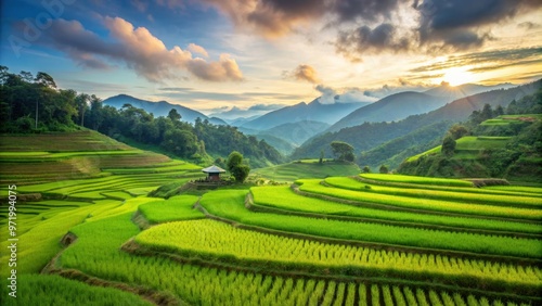 Fototapeta premium Beautiful view of green rice paddy fields landscape, green, rice paddy,...