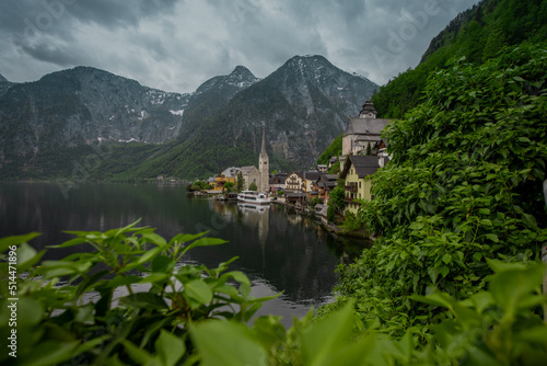 © Anze, Fototapeta premium Beautiful view of Hallstatt, Austria, picturesque village on the edge of a lake. Classical view looking through the window in a bush.