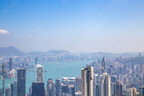 © Uraiwon, Naklejka premium Beautiful view of HongKong skyline in the day of bright and clear blue sky