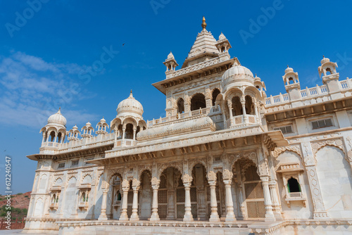 © mitrarudra, Naklejka premium Beautiful view of Jaswant Thada cenotaph, Jodhpur, Rajasthan, India. Built out of intricately carved sheets of Makrana marble, they emit a warm glow when illuminated by the Sun. Blue sky background.