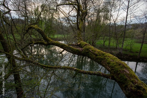 Fototapeta premium Beautiful view of laid tree over the river with a beautiful reflection of...