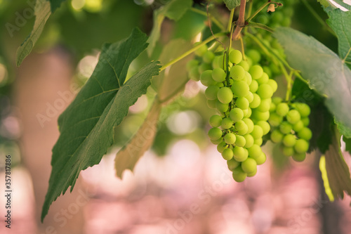 Fototapeta premium Beautiful view of lush green grapes hanging on grapevines on a sunny day.