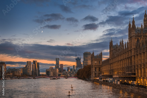 © Lana, Obraz premium Beautiful view of Parliament buildings, river Thames and city buildings in London, England, at sunset with rising moon