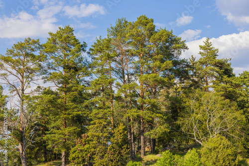 © Alex, Fototapeta premium Beautiful view of pine trees forest against blue sky with white clouds on summer day. Sweden.