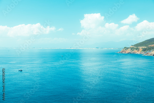 © romanovad, Fototapeta premium Beautiful view of sea and mountain. Calm water in bay with rock, bush and green forest and clouds in background