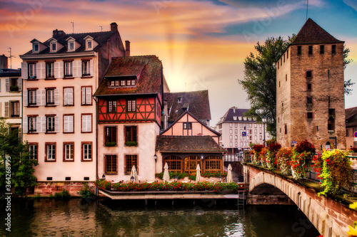 © littleny, Fototapeta premium Beautiful view of Strasbourg France at sunset with half timbered architecture and canal in view