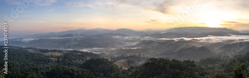 © Thanaphong, Fototapeta premium Beautiful view of sunrise above the green valley. view from the top view of mountains. Amazing nature landscape.