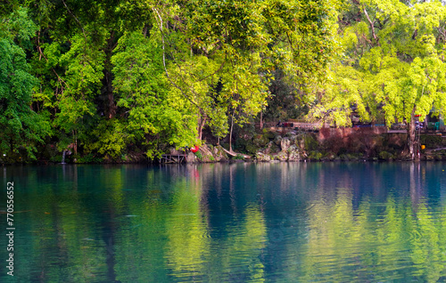 Obraz premium Beautiful view of the blue lake surrounded by trees around it.