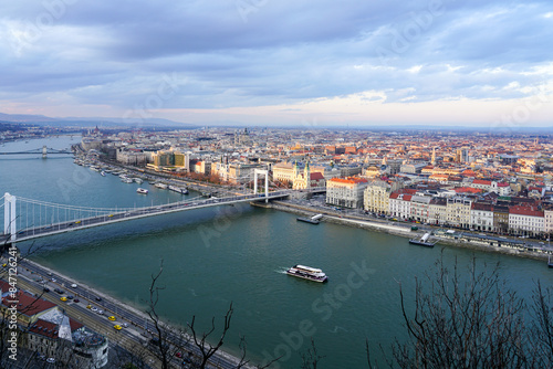 © Zigmunds, Fototapeta premium Beautiful view of the city of Budapest with Danube river with bridges from Gellert Hill cloudy sky