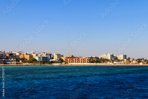 Naklejka premium Beautiful view of the coastline with houses and hotels in Hurghada, Egypt. View from Red sea