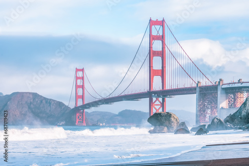 Fototapeta premium Beautiful view of the Golden Gate Bridge in San Francisco, pastel colors. Concept, travel, world attractions