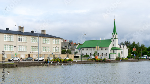 © Gian, Obraz premium Beautiful view of the Iceland Church with white walls and green roof in front of the lake on a cloudy sky in Reykjavik, Iceland. Architecture, landmark, worship service, religion, faith concept