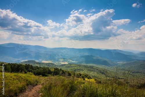 Fototapeta premium Beautiful view of the Ukrainian mountains Carpathians and valleys.Path and beautiful green mountains in summer with forests and grass. Water-making ridge in the Carpathians, Carpathian mountains