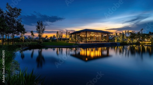 © Dzikrul Husnani, Fototapeta premium Beautiful view of Thefirst Pl Innovated Modern Beauty Beautiful View Blue Sky with reflection in water at sunset, Island from the lake featuring covered Backbar and Aesthetic designed lawn area below