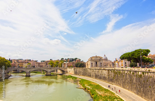 Fototapeta premium Beautiful view of Tiber river and old stone bridge near Castel Sant'Angelo...