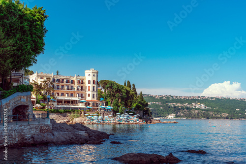 Naklejka premium Beautiful view of waterfront in Opatija with the beach and hotels, Croatia