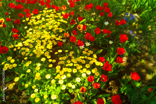 © Dzmitry, Obraz premium Beautiful view of yellow-red blooming flowers in spring.