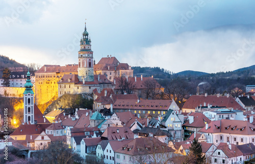 Fototapeta premium Beautiful view to Cesky Krumlov castle and its tower in Czech republic at sunset with dramatic clouds. Horizontally.