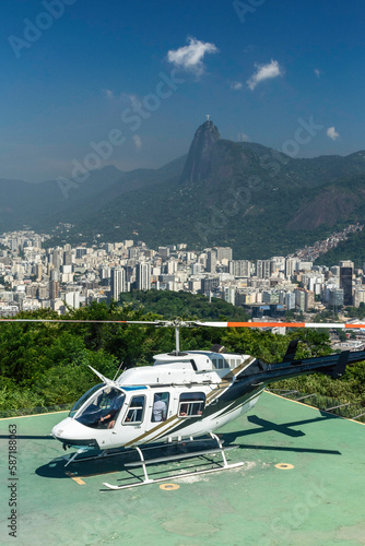 Obraz premium Beautiful view to helicopter taking off from green Sugar Loaf mountain