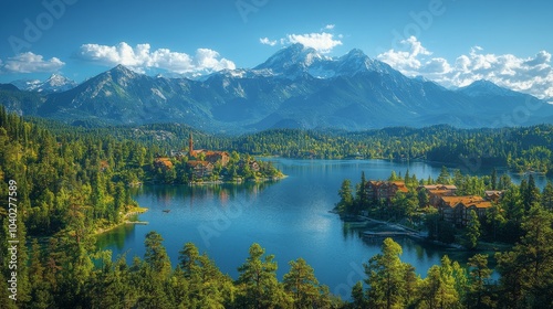 Naklejka premium beautiful view with mountains, lakes and forests as the background