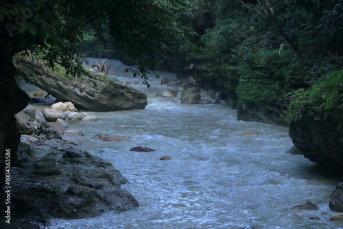Fototapeta premium Beautiful views of the flowing river at Tapkeshwar Temple in Dehradun from...