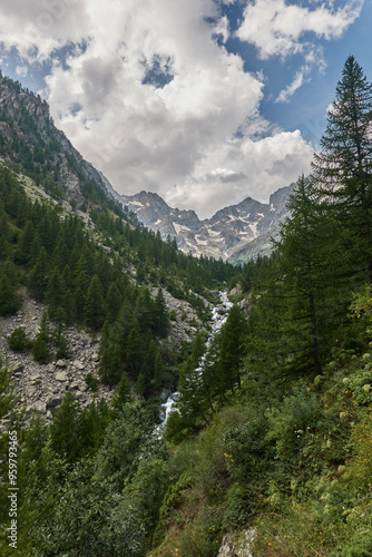 © JaviJfotografo, Fototapeta premium Beautiful views of the mountains and the glacial cirque on the route to the Refuge des Bans, in the Écrins National Park. Alps. France