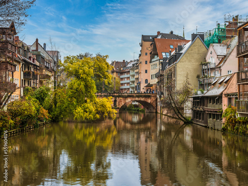 Fototapeta premium Beautiful village buildings and Karls bridge on Pegnitz river in Nuremberg, Germany.tif