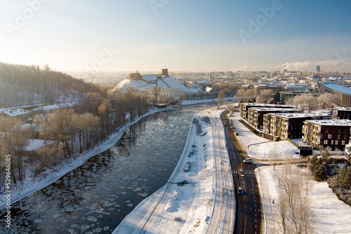 © MNStudio, Naklejka premium Beautiful Vilnius city panorama in winter with snow covered houses, churches and streets. Aerial evening view. Winter city scenery in Lithuania.