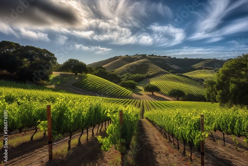 © Snapshooter, Naklejka premium Beautiful vineyard in the countryside at sunset around hills and mountains. Generative AI