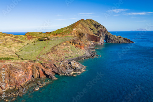 © Leonid, Fototapeta premium Beautiful volcanic rocky coast of Atlantic ocean on Ponta de Sao Lourenco on Madeira island, Aerial wide shot