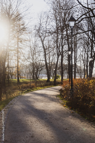 Obraz premium Beautiful walking path in a park on a sunny autumn day with bare trees, light posts, sun and many shadows.